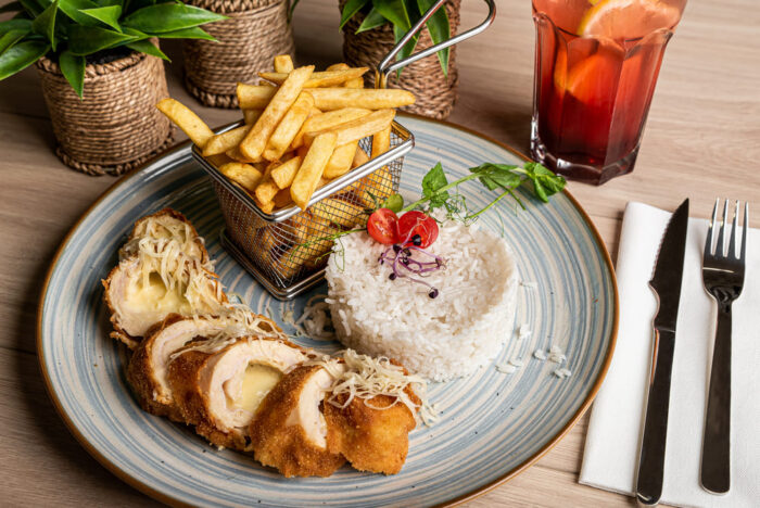 Kívül ropogós, belül olvadt sajt és szaftos sonka – igazi ízbomba! A vegyes köret tökéletesen kiegészíti ezt a bőséges fogást.