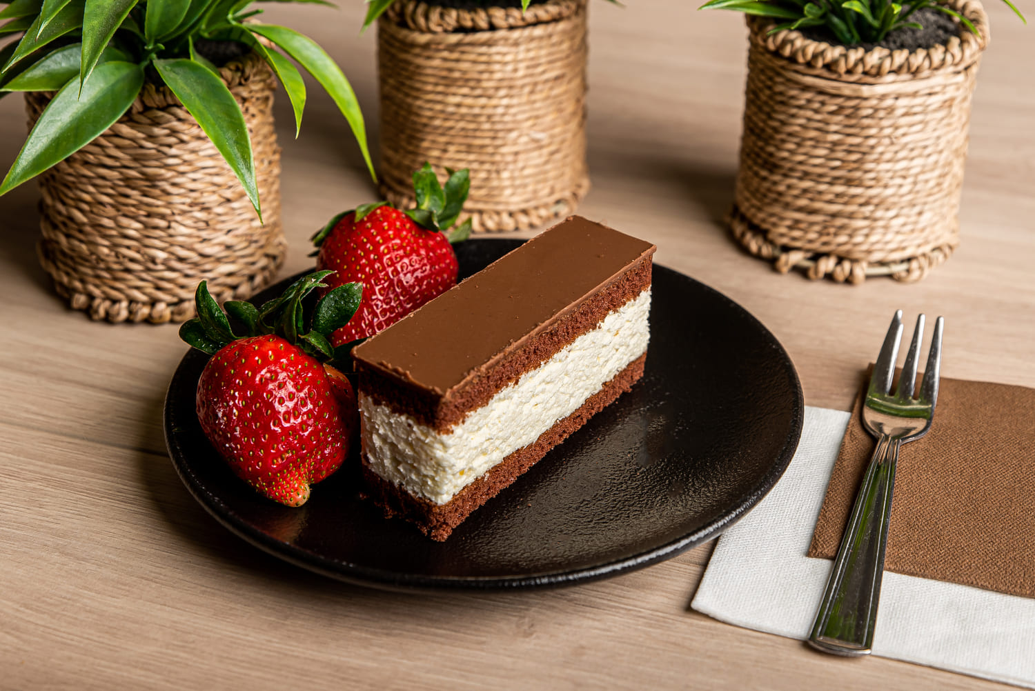 Kakaós piskóta, citromos-túróval, csokoládéval bevonva. A klasszikus kedvenc torta formában, tökéletes egyensúlyban az édes és frissítő ízek között.
